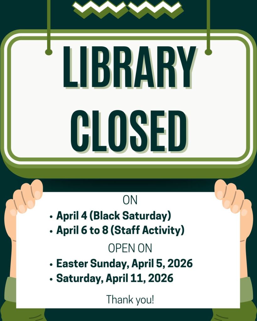 The library will be closed on April 4 (Black Saturday) and April 6-8 (Staff Activity).